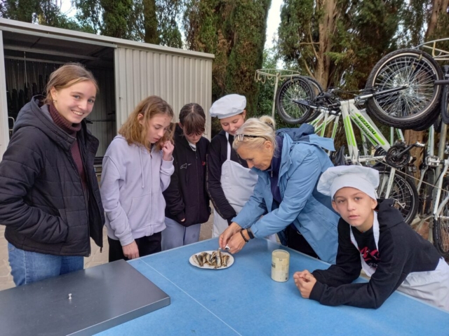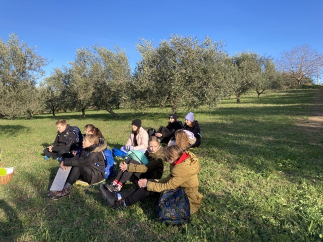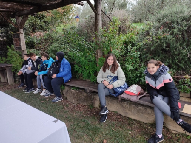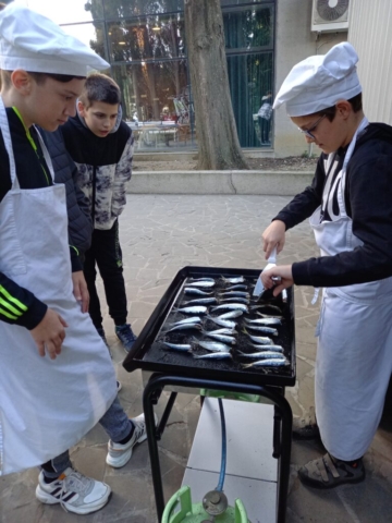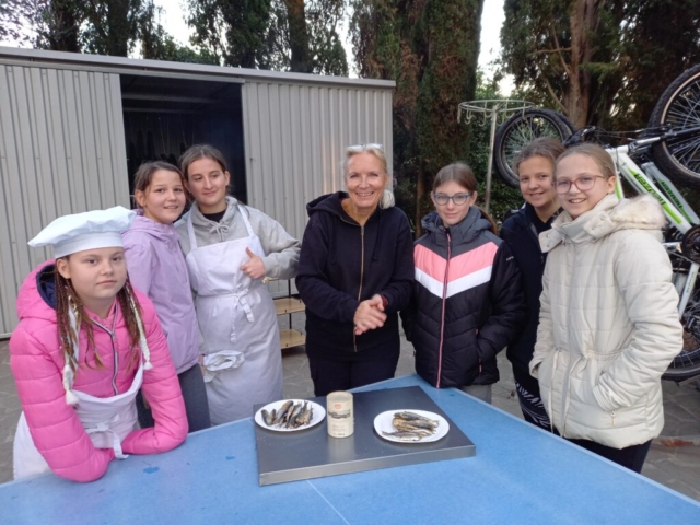 Z drugo skupino smo obiskali ekološko kmetijo, kjer smo si ogledali nasad oljk in degustirali oljčno olje. Popoldne smo se naučili očistiti sardele, ki smo jih nato spekli na žaru. Njami, so bile dobre :-).