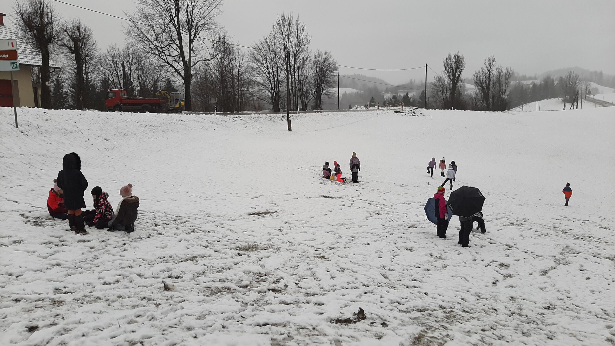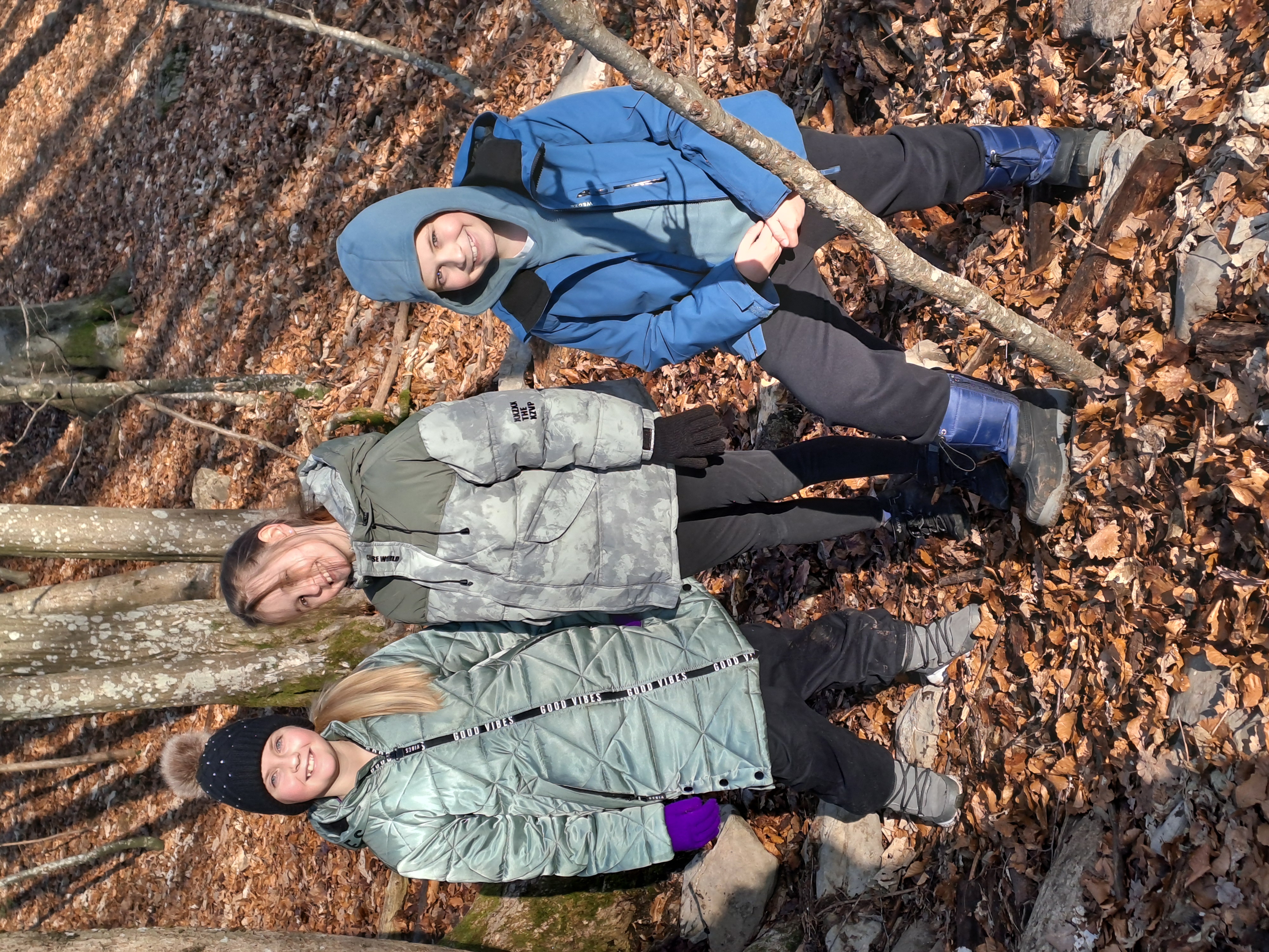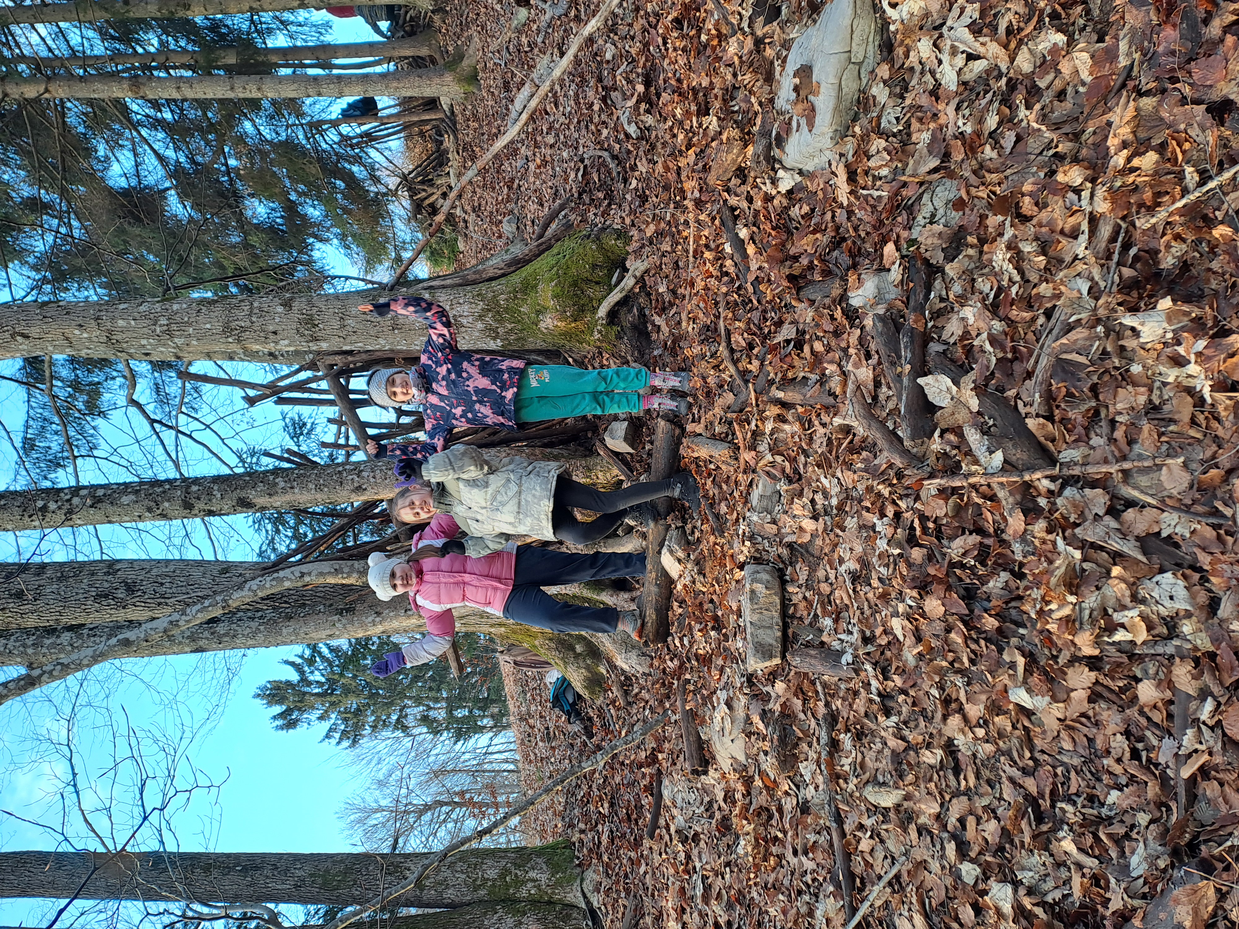 V ponedeljek smo z avtobusom prišli na Medvedje Brdo. Po malici smo se sprehodili do potočka, nato pa po bližnjici odhiteli na kosilo. Siti smo se odšli igrat v sobe. Popoldne smo se učili o preživetju v naravi in zgradili svoje bivake, zvečer pa smo se po temi s svetilkami sprehajali med snežinkami.
